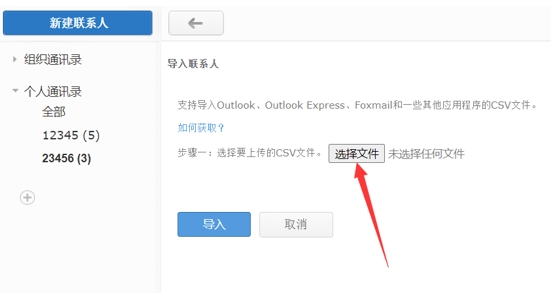 網頁上導入通訊錄時,文件需要是csv格式,為了保證格式的正確,建議您先導出一個文件樣本,然后替換導出文件中的姓名,地址等字段,再導入即可:
