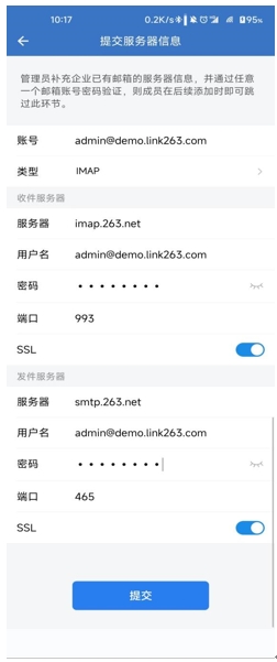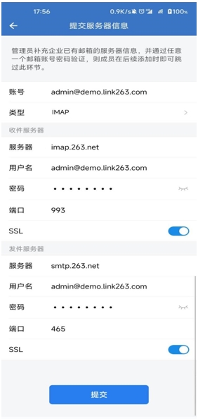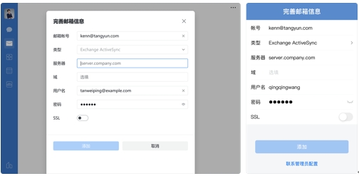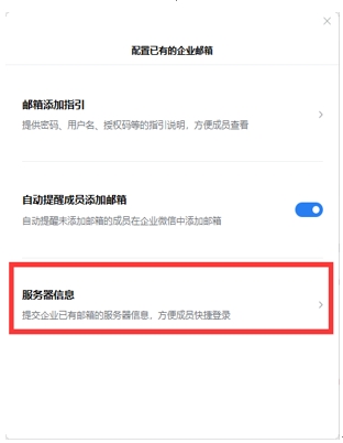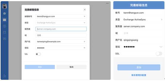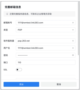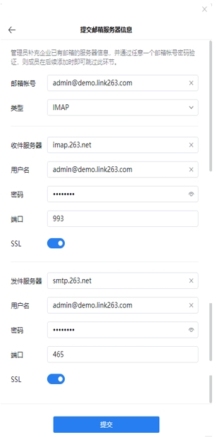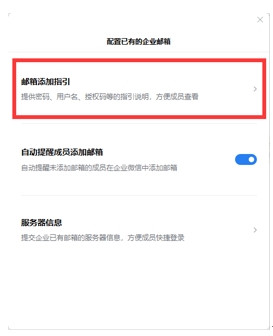 成員在添加過程種可能遇到需要提供郵箱協議、服務器、用戶名等信息的情況,管理員可根據企業實際補充指引。