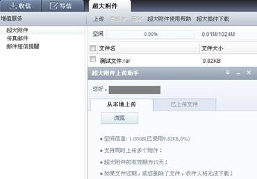 當您登錄進網頁郵箱之后,可以在左側的“增值服務-超大附件”中下載并安裝“超大插件”,這樣有較大的附件需要發送時,可以點擊“上傳”,通過超大附件上傳助手將附件上傳到超大附件的已上傳文件中,已上傳文件自上傳之日起保留15天,期間您可以選擇已經上傳的超大附件給對方發送。