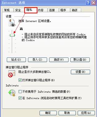 (1)瀏覽器隱私級別過高即會導致此問題,請您按照下圖檢查瀏覽器的隱私級別是否設置為“高級”或者“阻止所有Cookie”,將隱私級別降為高級以下,確定之后重啟瀏覽器測試即可;