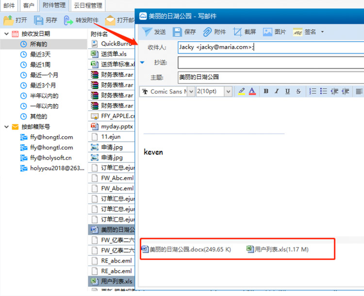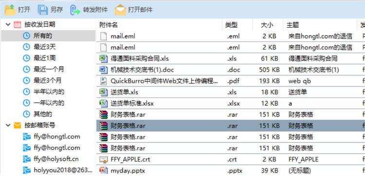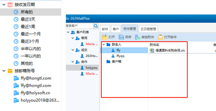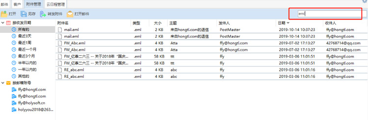 附件分類, 按收發日期,按郵箱帳號,選擇客戶后出現按客戶的附件分類,如圖