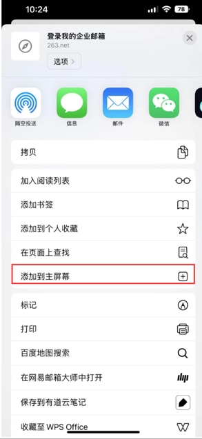 以iphone為例,在您的手機瀏覽器的工具欄中點擊按鈕,彈出選擇菜單,然后點擊“添加至主屏幕”,系統就會在主屏幕上創建一個應用圖標,點擊該圖標會自動進入263郵箱登錄頁面。如下圖: