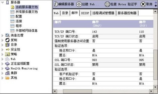 * 運行domino server,在domino server窗口中可見POP3服務啟動信息。打開Domino Administrator,進入單擊“配置”附簽,服務器――>當前服務器文檔――>端口――>internet端口――>郵件,將“郵件(POP3)”列如圖所示設置