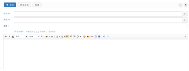 1) 進入寫郵件頁面,在“收件人”輸入框中填寫接收郵件者的郵件地址,在“抄送人”輸入框中填寫抄送人郵件地址,在“主題”輸入框中填寫郵件的主題,并在內容框內填寫郵件的內容,然后點擊“發送”按鈕,即可完成一封標準郵件的發送。(也已通過點擊“添加密送”按鈕,為郵件添加密送人的郵件地址)