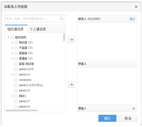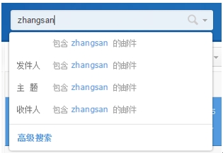 2) 輸入郵箱地址時,支持智能聯想,您可以通過拼音首字母、中文或郵件地址快速的添加通訊錄中已存在的聯系人地址。(例如您可以通過輸入zs 將“張三”的郵件地址聯想出來)且可顯示收件人所在的組織架構。