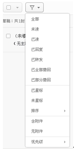 當進入一個文件夾(如收件箱),點擊工具欄的“篩選”按鈕,可以選擇需要篩選或排序的條件,對您的郵件進行篩選和排序,方便對郵件進行管理: