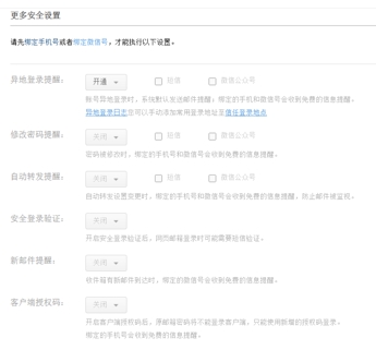 手機號綁定成功后,可以開通操作提醒,包含異地登錄提醒,修改密碼提醒,自動轉發提醒,安全登錄驗證;
