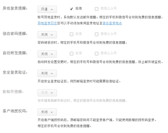 網頁郵箱支持綁定手機號或者綁定微信號,綁定之后,可以開通安全提醒;
