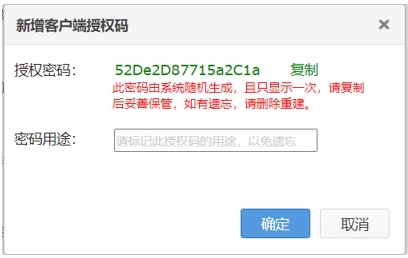 新增客戶端授權碼只顯示一次,妥善保管,如有遺忘,請刪除重建。