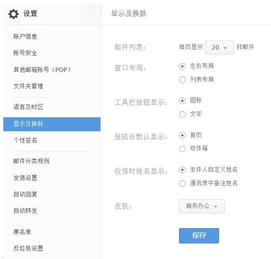 點擊右上角頭像打開菜單,然后點擊“設置”進入郵箱設置頁面,選擇“顯示及換膚”標簽: