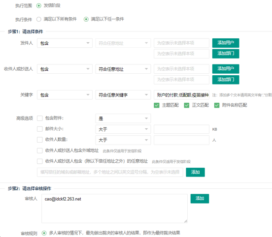 10.郵件審核限制關鍵字發出,如果包含自定義關鍵字,則需要相關責任人審核后,郵件才能正常發出。