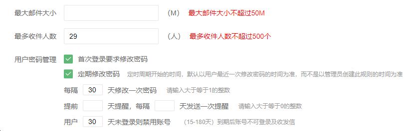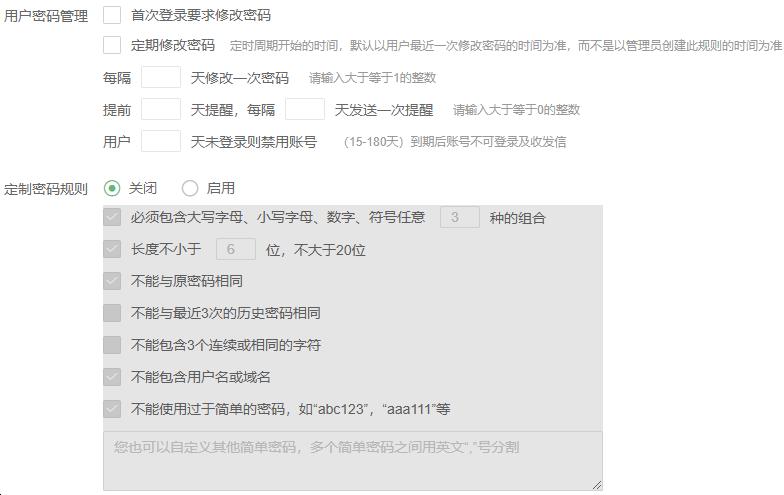 7.密碼包含大寫字母、小寫字母、數字、符號任意3種的組合,不少于6位,不大于20位,不能與原密碼相同,不能包含用戶名或域名,不能用過于簡單的密碼,如abc123、aaa111等。