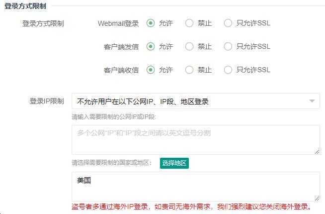 4.(可選)限制IP登陸,只允許公司公網環境(或指定地區)使用郵箱。
